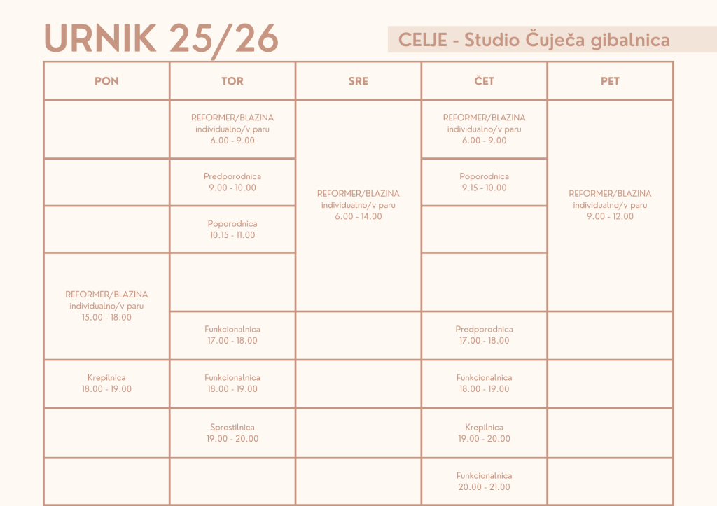 Z vadbeno sezono 2025/26 pričnemo septembra 2025. Z vadbo na reformerju pričnemo oktobra 2025. Pridružite se nam lahko kadarkoli tekom sezone glede na razpoložljiva prosta mesta.